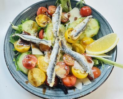 Anchois marinés . Tomates cerises . Salade mesclun .Concombres ....